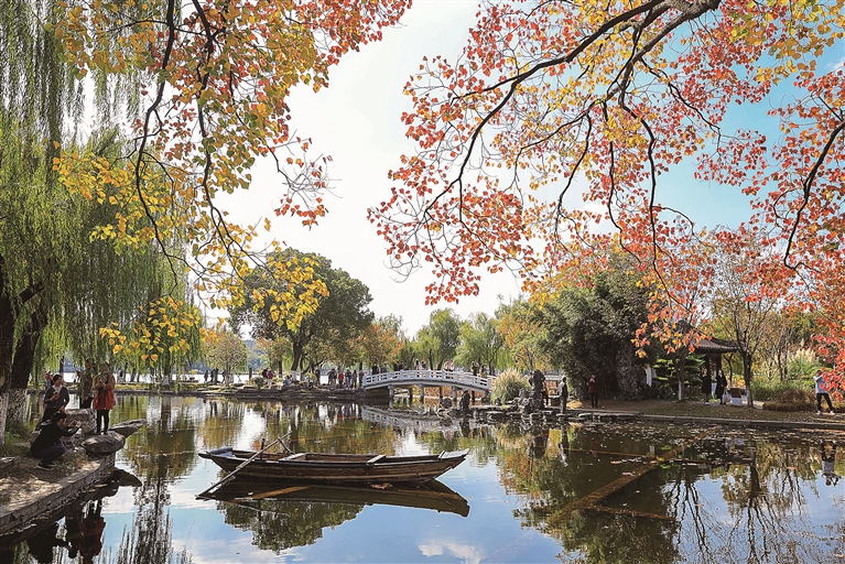 图为11月12日,游客在南京莫愁湖公园赏景游玩。