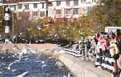 近日,天津市迎来候鸟迁徙高峰,大批海鸥从寒冷的西伯利亚迁徙至滨海新区老码头附近的海河岸边越冬,每天栖息在这里的海鸥达到上千只,吸引了许多游客前来观赏。