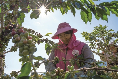 图为11月16日,咖农在云南省保山市隆阳区烫习村一处咖啡园采摘咖啡果。
