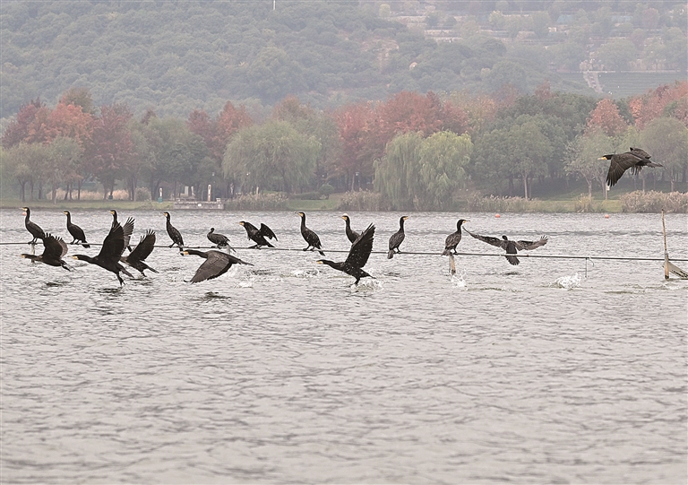 入冬后,大批来自北方的鸬鹚又如约而至,在湘湖“安营扎寨”。它们时而掠过如镜的水面,时而在枝头嬉戏,为冬日的湘湖平添了一份生机与野趣。