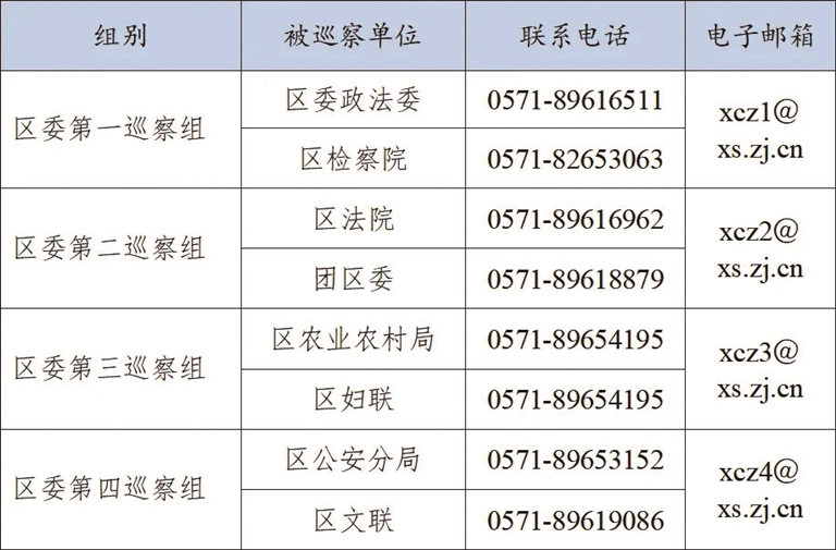根据有关规定,区委巡察组主要受理反映被巡察单位领导班子及其成员和下属单位领导班子及其成员违反政治纪律、组织纪律、廉洁纪律、群众纪律、工作纪律、生活纪律的来信、来电、来访。对于不属于巡察受理范围的信访问题,将按规定移交有关部门处理。对巡察组工作人员的监督,可以向区委巡察办反映。监督方式:区委巡察工作领导小组办公室,联系电话0571—83897180,电子邮箱xcb@xs.zj.cn。
