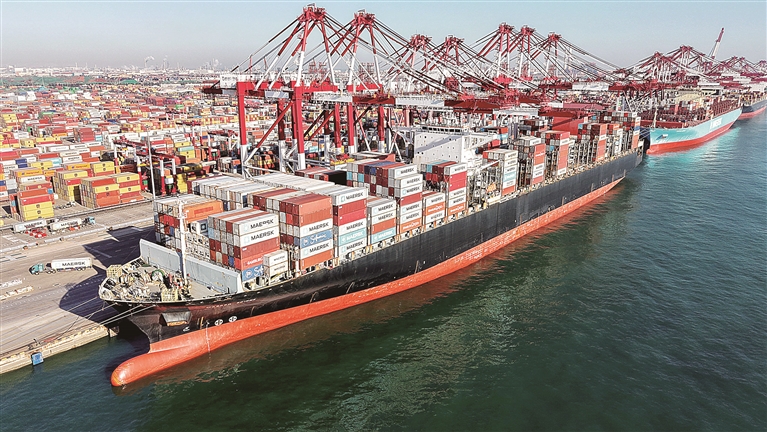 图为12月8日,货轮在山东港口青岛前湾港装卸外贸集装箱。