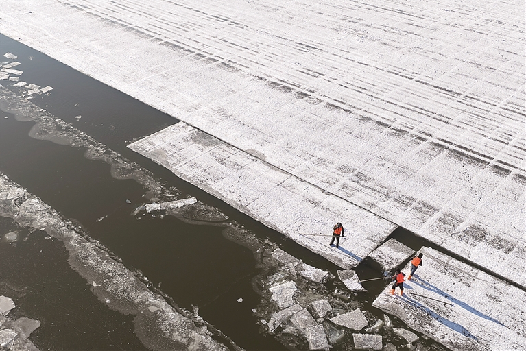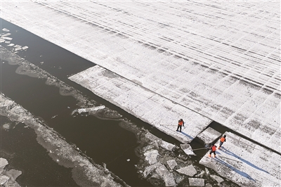 图为12月9日,工人在松花江哈尔滨段采冰。