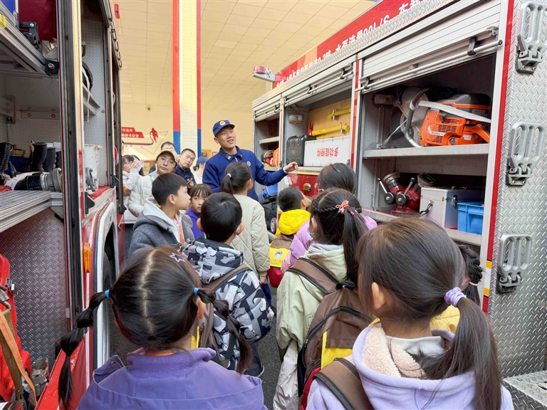 随后,大家实地观看了消防车及随车器材装备,兴趣高涨,围着消防员叔叔不断提问。消防员叔叔也详细介绍了常用消防器材的功能与使用方法。穿上消防服、坐上消防车,是许多孩子向往的场景。在消防员的指导下,小记者们沉浸式体验了一回“消防员”的日常,也感受到了这份职业背后的责任与担当。(文/摄 宣舒瑶)