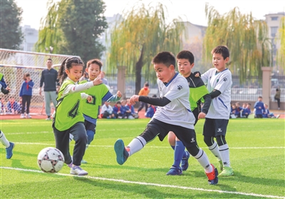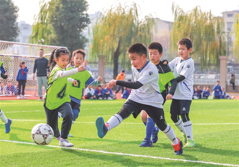 近日,高桥小学文源校区举行了班级足球联赛。赛场上,小队员们巧妙配合、攻防有序;赛场边,啦啦队呐喊助威、热情似火。