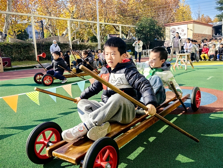 中班的“文化游戏创想营”同样精彩。孩子们画图纸、选材料、定规则,用轮胎、扁担等材料搭建游戏场景。“秋千荡悠悠”游戏将秋千与运粮结合,“伞花抛物”游戏让雨伞变成接球工具,“挑布过江”游戏则用扁担传递责任……游戏结束后,孩子们又化身“小评审”投票选出最喜爱的项目,在实践中学会了欣赏与反思。