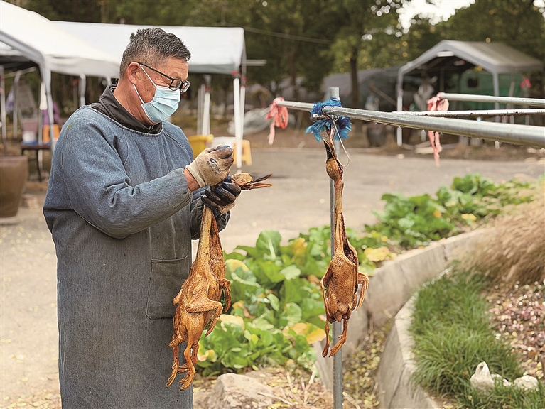 “这是今年做的第二批酱鸭了,昨天刚宰杀处理好,一共158只,已经被老客户预订了。”农场负责人沈柏尧笑着介绍,此前第一批百来只酱鸭上架后,也很快售完了。
