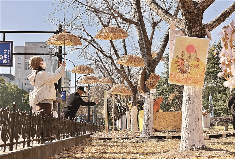 16日,由区综合行政执法局与区第二中等职业学校联合主办的“金叶奇想”银杏艺术展在城河公园开展,银杏叶小屋、银杏叶画、银杏叶伞……作品展现了年轻人对自然、创意与青春的独特视角,吸引了不少市民驻足观赏。