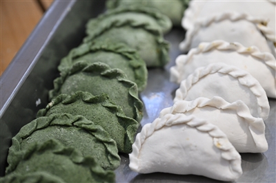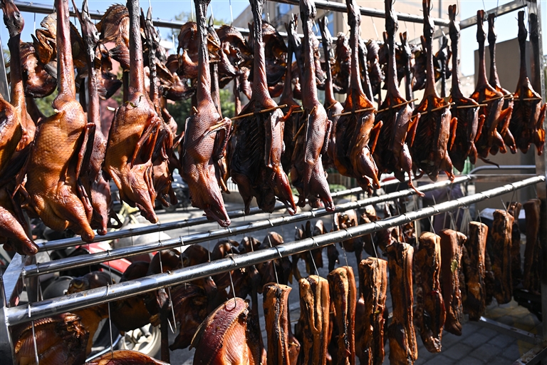空气里却另有一番热闹。阳光最好的院落,竹竿上晾出了一串串酱鸭、酱肉,油亮亮地渗着琥珀的光,那是阳光与时间一同腌渍出的丰厚质地。窗户里则飘出另一种温热的水汽,大家揉面、包馅,做出冬天里令人想念的味道。