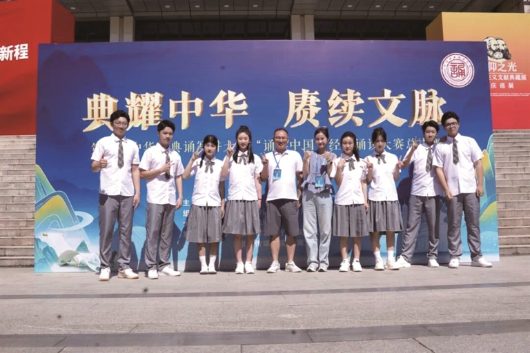 回溯8月西南大学光大礼堂的全国总决赛现场,这支由高三播音特长班王亦然、王艺雅、裘俊杰、陆可钰、俞嘉龙、田曜宁,及高二播音特长班牛曼晴、杜欣怡组成的团队,以郭小川经典诗作《闪耀吧,青春的火光》为蓝本,在铿锵节奏中展现青春的昂扬姿态,在诗意升华中传递理想的炽热光芒。