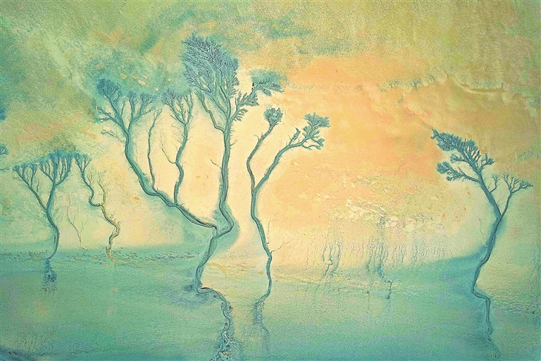 冬日,钱塘江退潮后,滩涂上浮现出形态各异的“潮汐树”,宛如一幅浑然天成的山水画。