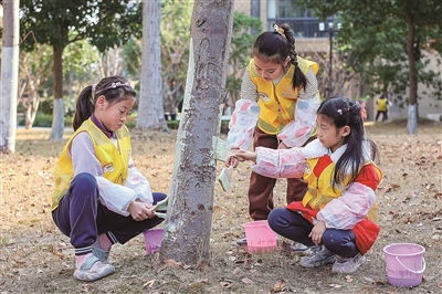 近日,蜀山街道郡乐社区联合广乐公寓物业服务中心开展“冬日绘暖衣,护树待春熙”志愿活动。工作人员备好涂白工具并讲解其防冻防虫、美化环境的作用,孩子们化身“护树小卫士”,在指导下为树木涂白,活动既传授了护树知识,更在孩子们心中播撒下爱护自然的种子。