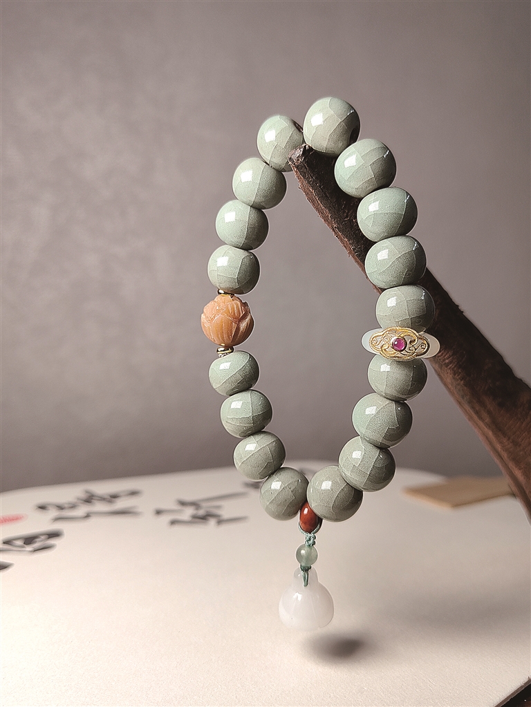 手串则是另一层突破。毕竟,能将官窑瓷珠穿成手串,本身就是一项技术攻关,是古陶瓷新质生产力的应用成果的展现。为此,她和团队花了小半年的时间研发,首创“吊烧工艺”,用钨丝将瓷坯悬空固定后,再送入1300℃高温窑中烧制,还要特别注意瓷珠间保持一定距离,“成本可能会高一些,但好在效果比较成功,每一颗瓷珠都保留了南宋官窑瓷的特色。”