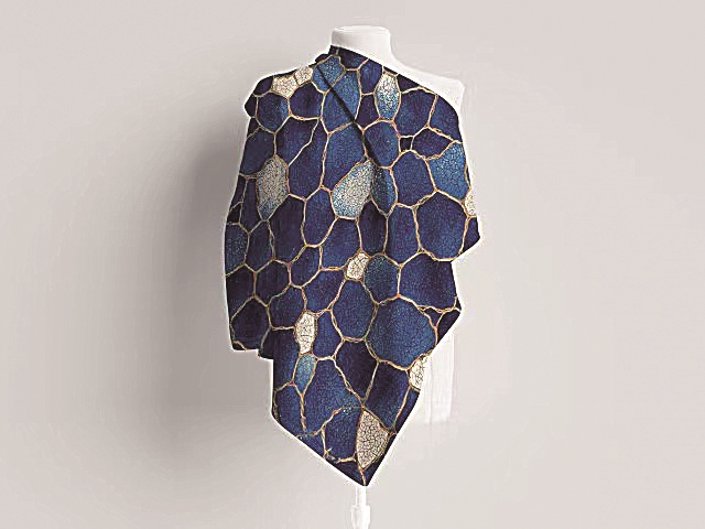 丝巾的纹样,很多是取自南宋官窑的特色,比如《丝路瓷语》系列其中一条方巾,青蓝的底、鎏金的纹,一冷一暖间,就如同把瓷器上的冰裂纹“摘”了下来,令人想起乾隆帝那句“纹犹鳝血裂冰肤”的赞叹。