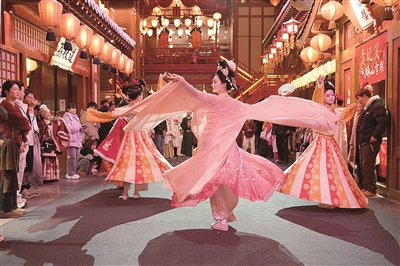 图为演员在街区内进行沉浸式表演《花魁巡游》。