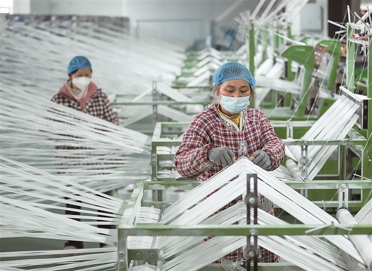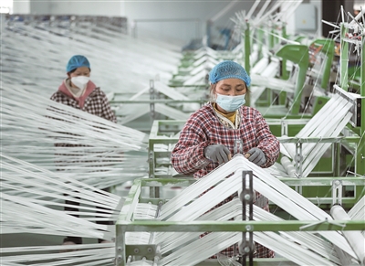 图为1月4日,在贵州省铜仁市玉屏侗族自治县一家包装有限公司,工人在赶制吨袋订单。