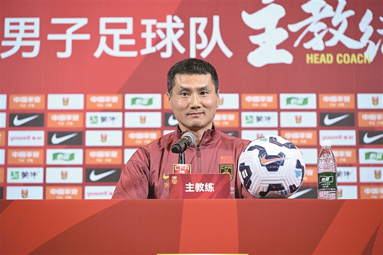 1月4日,中国国家男子足球队在广东肇庆举行媒体见面会,主教练邵佳一正式亮相。 图为当日国足主教练邵佳一在媒体见面会现场。新华社记者 邓华 摄