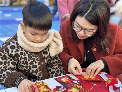 “石韵拓福”摊位前,孩子们小心翼翼地将宣纸铺在青石板上,然后用拓包蘸取红墨轻轻拓印,随着小手的按压,吉祥的图案慢慢显现。红彤彤的墨色映着孩子们笑盈盈的脸庞,拓印的不仅是新年的福韵,更是传统非遗文化在童心间的传承。