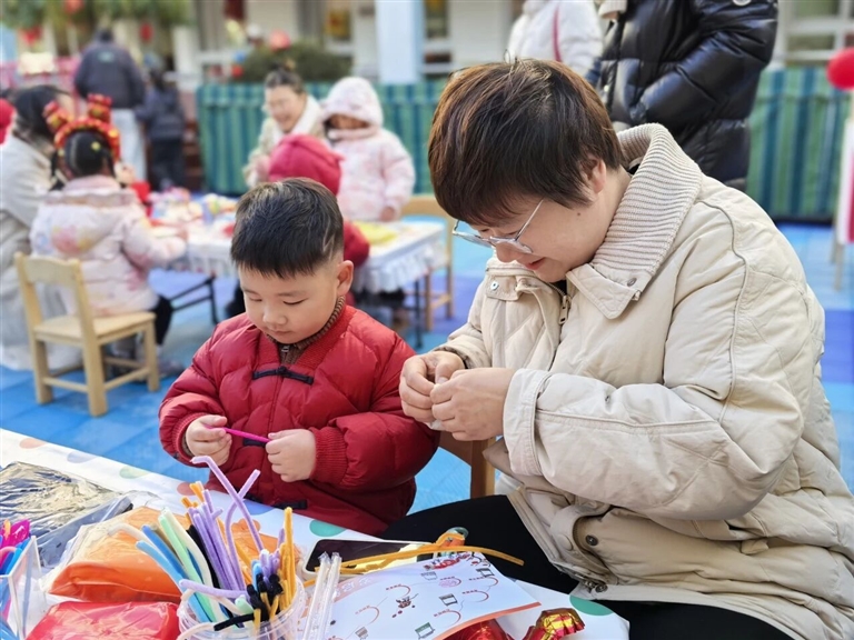 “福袋寄暖”摊位前,孩子们和家长一起围坐桌边,小手捏着彩布、拿着针线,认真地裁剪、缝制福袋。从穿针引线到拼接布料,每一个步骤都凝聚着孩子们的专注与巧思。在亲子协作的时光里,孩子们把对新年的期盼,都缝进了这小小的福袋之中。