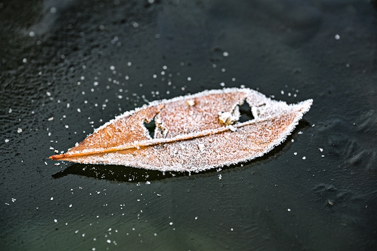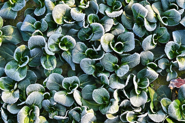 今冬第一场雪,为峰峦描上了银边。平原阡陌间,浅塘薄冰如琉璃嵌地,田畦里的青菜则覆上了一层茸茸的浓霜,在清冷的晨光下,宛如洒满了细碎的钻石。