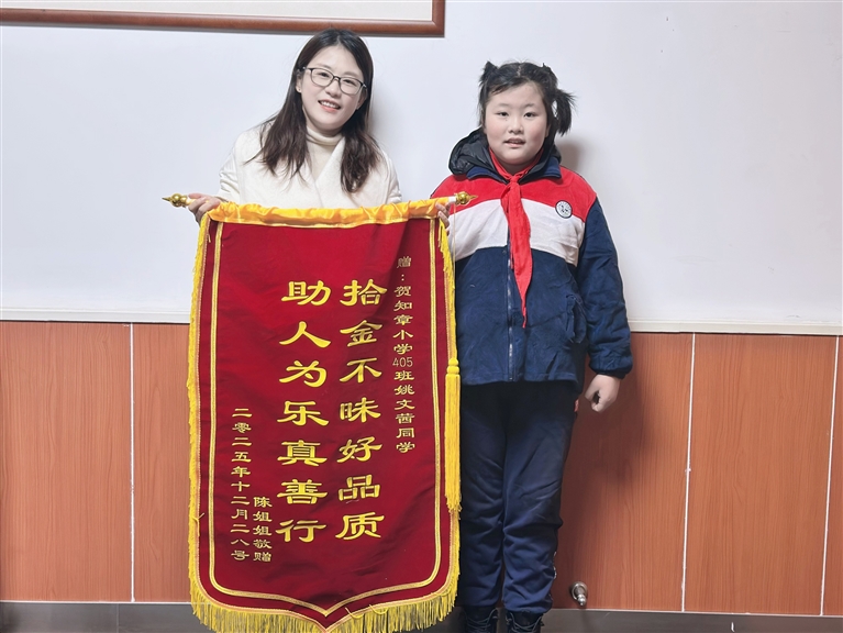 当老师把锦旗递到姚文茜手中时,这个平时话不多的小姑娘,却做出了一个让人动容的决定。“老师平时总教导我们要诚实守信、乐于助人。”姚文茜认真地说,“我只是做了该做的事。这面锦旗应该属于学校,是学校教会了我这些道理。”