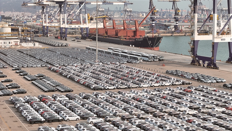 图为1月14日,大批国产汽车在山东港口烟台港集结等待装船出口。
