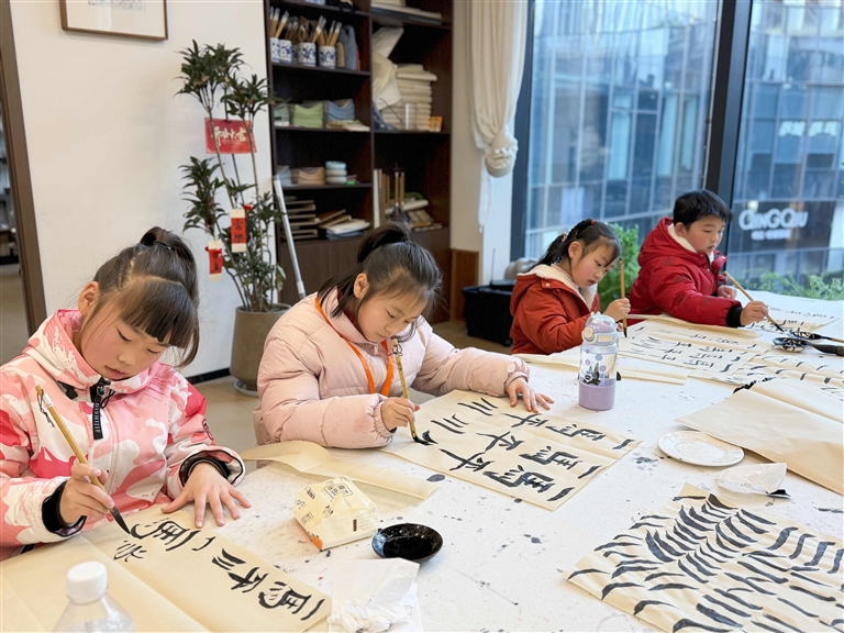 1月11日,枕星书画内墨香萦绕。20余名小记者在中国美术学院硕博团队导师的引领下,开启了一场别开生面的书法体验之旅。从执笔、蘸墨到提按顿挫,老师细致讲解演示;孩子们凝神观察,提笔在宣纸上一笔一划认真临摹。笔尖游走,横竖撇捺渐显模样,一幅幅虽稚嫩却工整的习作在手中诞生。这不仅是技巧的初学,更是一次与传统美学的对话,在笔墨方寸间,孩子们为即将到来的新春,预先习得了书写春联福字的底蕴与心静。