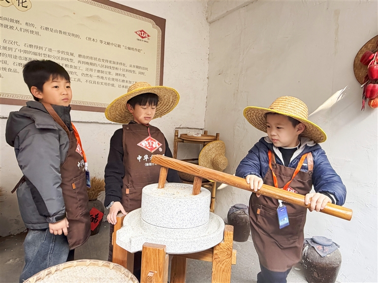 1月2日,小记者们踏上安昌古镇的石板路,开启一场沉浸式研学。他们首先聆听了古镇得名“安昌”的历史典故,理解地名背后“安定繁荣”的期盼。随后,小记者们来到了此次研学的核心目的地——拥有百余年历史的仁昌酱园。许多酱缸在冬日暖阳下静默陈酿,非遗传承人讲解着“夏日晒,冬日捞”的匠心坚守。孩子们目睹老师傅翻动酱坯,得知一缸好酱油需历经数年光阴,真切体会到“慢工出细活”的传统智慧与对时间的敬畏。漫步于全长1747米的明清老街上,小桥流水的江南风貌,与酱园里延续的活态传承相映成趣,让他们触摸到千年文化血脉的勃勃生机。