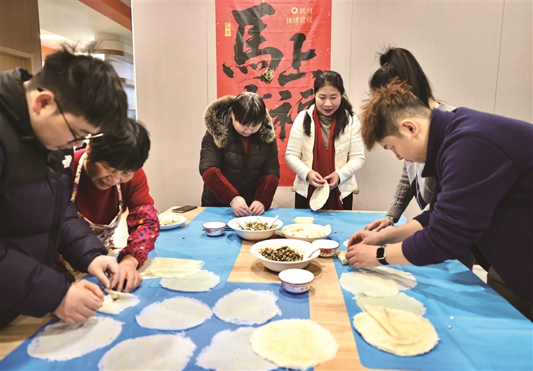 春节的脚步越来越近,年味渐浓。近日,在新街街道江南村,一场包春卷活动热闹进行。村民们围在一起包春卷,迎新春。
