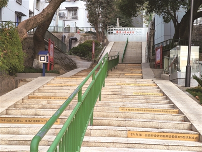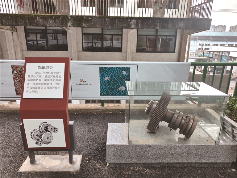 在居民们看来,潇湘社区的根在杭齿,“忠诚、奉献、团结、第一”的精神不能丢。在社区入口处,齿轮环抱石榴籽的 Logo特别显眼;社区里的两条道路分别命名为团结路和前进路;上山的石阶上贴着杭齿厂的相关文字介绍;老机床、齿轮箱等老物件被展示在各个角落。