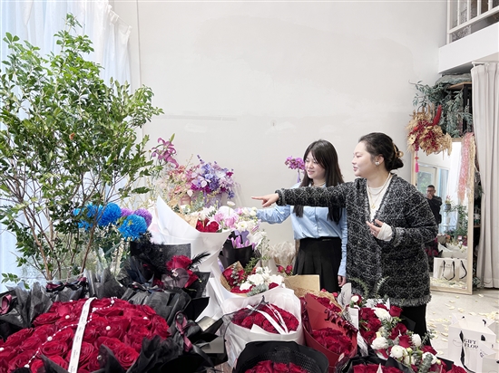 2月25日,记者在郅花世界鲜花店看到,前来选购鲜花的顾客络绎不绝。年轻情侣们手挽手,精心挑选着心仪的花束,脸上洋溢着幸福的笑容,市民虞璇玑正在挑选鲜花,准备送给她的闺蜜,花店老板热情地为顾客介绍着不同花束的寓意和特点。