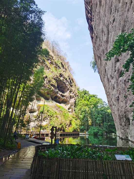 毕竟岁月不饶人,许多同学望岩兴叹,留在原地歇息,而我与一些不服老的同学则鼓起了勇气开始登山。记得六年之前,我曾把华山的五大险峰都踩在了脚下,还会惧怕这区区的李家岩吗?我一边拾级而上,一边自我嘀咕着。抬头是横空出世的陡峭山崖,一片赤红色的丹霞地貌中点缀着丛丛绿竹。这些不知什么年代形成的山崖斑斑驳驳,坑坑洼洼,十分奇特,蔚为壮观。我们四人结伴步上一段湿滑的台阶山道,赫然在目的是一块数百米长的凸出的巨崖,如同一块狭长的擎天大伞,又如一展翅的大鹏。穿行其下,不禁让人心潮澎湃,我举起双臂托着山崖,顶天立地,颇有“天欲坠,赖以拄其间”的气势。