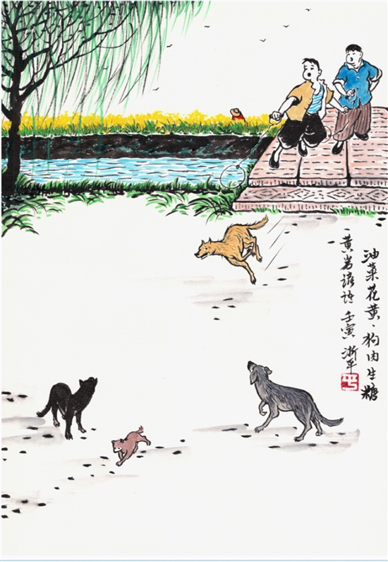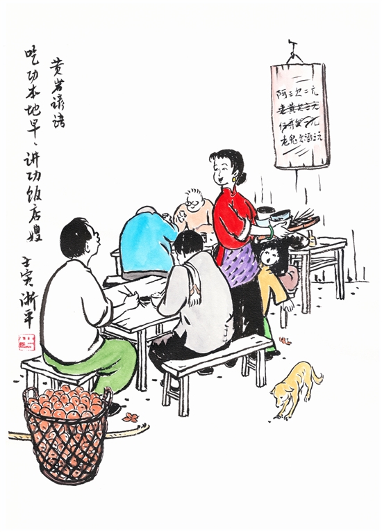 创作《漫画黄岩谚语》,我当作一件有意义的工作来对待,不仅是享受母亲记录的黄岩谚语中那些趣味,也作为孝顺的一种表达。在此期间,我基本停下写作,一门心思做这件事。为了确保漫画能体现黄岩地域文化特点,我除了查阅相关资料,还要时时向母亲询问一些情况,甚至连服装、建筑物、生活用具,都力求有黄岩特色。在时间相对持久的创作中,让我更深切地感受到母亲对家乡的情感,同时也学到了不少新知识。我想,能够用绘画形式表现黄岩谚语中的真善美,取决于我将它当作一件快乐的事来做。因为,这套漫画是为了母亲的快乐而画的。