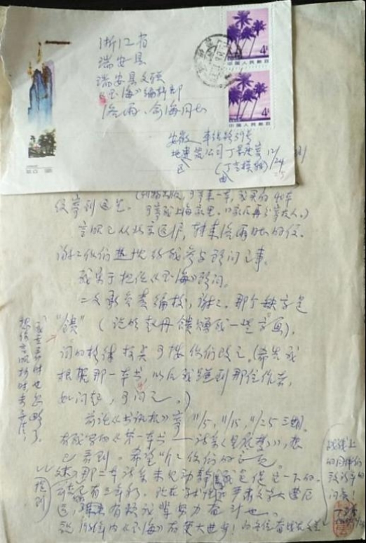 因为该期《玉海》已经破例同时刊登了丁前辈的一文一信,篇幅十分拥挤。这封信和它的附件只好暂留待用,这一留就留了数十年。幸好我一直珍藏着这些信札,七次搬家都舍不得丢弃,终于保住了丁老的珍贵手迹。这也许是天意吧!