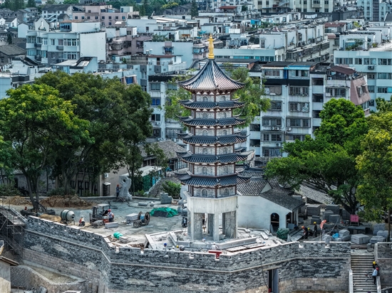 9月3日,记者在西山看到,作为市重点文化修复项目的西山塔重建工程塔身主体已基本完工。这座融合宋式建筑风格与现代建造技术的文化地标,建成后将与国旗教育馆、忠义街历史街区形成联动,进一步丰富瑞安古城的历史文化风貌。