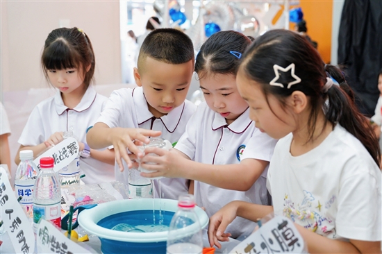 同步进行的还有人气火爆的科普集市。“如何在树叶骨架上作画”“盔甲勇士和草丛歌王相遇会发生什么”“糖水彩虹里蕴含着什么科学原理”……科普互动区吸引青少年穿梭其中,尽情探索科学的奥秘。小朋友们还将“家庭实验室”的活动成果带到现场展示。来自集云实验小学的陈暖昕在现场分发太空特长丝瓜种子,吸引了许多人的关注。她的母亲郑女士告诉记者,今年是她们家参与“家庭实验室”活动的第二年,此次派发的种子正是去年亲手培育获得的成果。“这类科普活动既生动又有趣,不仅激发了孩子们对科学的兴趣,也拉近了科技与日常生活的距离。”郑女士说。