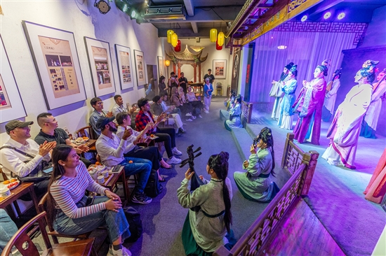 这里还建立活化的非遗传承体系。在非遗馆,游客能近距离感受被誉为“活化石”的木活字印刷术;可以观摩蓝白交织、图案精美的蓝夹缬。在“瓯说”等非遗体验店,仅需一小时,便能完成从捞纸到制成一盏独特皮纸心灯的古法造纸全过程。非遗不再是橱窗里的展品,而是通过节庆活动、常态展演、手作工坊等形式,生动地融入古城的日常肌理,让历史变得可听、可尝、可亲手创造。