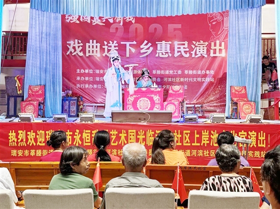 本报讯(记者 陈丹丹)连日来,莘塍街道河滨社区联合瑞安市文化和广电旅游体育局,举办“强国复兴有我”系列戏曲送下乡惠民演出活动,多场精彩演出在上岸池文化宫轮番上演,让辖区居民在“家门口”乐享文化大餐。