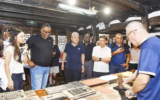 在平阳坑镇,拉蒙·雷波列特一行参观了中国木活字印刷展示馆,深入了解这项入选联合国教科文组织“急需保护的非物质文化遗产名录”技艺的悠久历史与文化内涵,并体验了木活字印刷过程,感受其匠心传承和深厚魅力。随后,他们前往东梨民艺博物馆,近距离了解夹缬这一古老技艺,领略非遗所展现的传统文化之美。