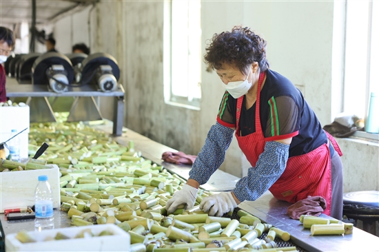陶山镇前途村果蔬专业合作社,工作人员正在为甘蔗切段。 | |  |