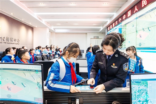 当天14时,研学之旅首站来到市公安局。在一楼展区,同学们在一张张老照片、一件件老物件前驻足,了解瑞安公安的发展历程和获得的各项荣誉。在110指挥中心,同学们听“萌警官”现场讲解反诈知识,近距离观察执法记录仪、防暴盾牌等警用装备……活动环节紧凑,大家听得津津有味,积极参与互动,现场气氛热烈。
