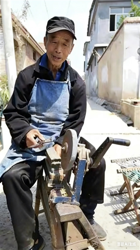 身穿缀着补丁的灰布衣裳,右肩扛着一条长凳,凳上固定着一块磨刀石,拴着一只水罐,手里提着一套磨刀工具,不紧不慢地走着,时不时扯开嗓子喊一声“磨剪子嘞,戗菜刀!”这就是当年农村经常见到的“磨刀客”形象。