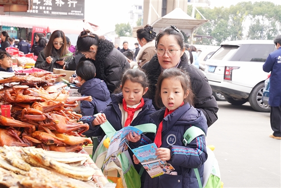 当天13时许,一、二年级全体学生在老师与家长的带领下,手持精心设计的“探鲜小护照”,兴致勃勃地走进“水产城”,开启了一场集知识、趣味与挑战于一体的闯关之旅。现场,孩子们化身观“鲜”小侦探,穿梭在琳琅满目的摊位间,寻找虾皮、干虾、鳗鱼干、鸭舌等特色年货。遇到不认识的生僻字,大家立刻拿出字典查阅,边认边记,在实践中拓展识字量。“今天我在水产城找到了黄鱼鲞,我认识了‘鲞’这个生字,也知道了这个字的意思是剖开并晾干的鱼。”学生张梓馨说。