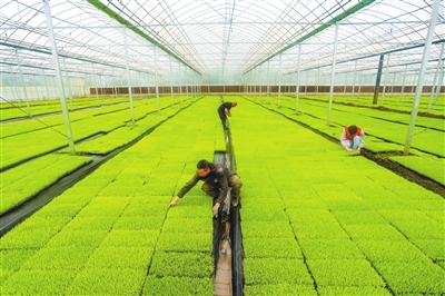 4月18日,长兴县吕山乡现代育秧中心,种植户正在大棚内摆放育秧盘。今年,吕山乡加快推行育秧集约化、规模化和工厂化生产,建立“工厂化”水稻育秧大棚,采取订单形式,集中培育早、晚稻秧苗,为粮食高质量生产奠定基础。 记者 吴拯 摄