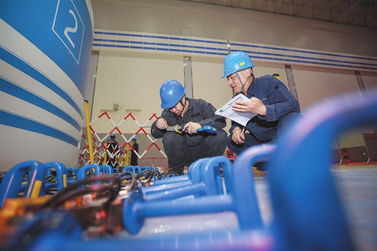 4月17日,在长龙山抽水蓄能电站地下厂房春检现场一派繁忙景象,工作人员重点对机组进行检查、评估、清扫、修理、优化,做部分预防性试验,消除设备隐患和缺陷。
