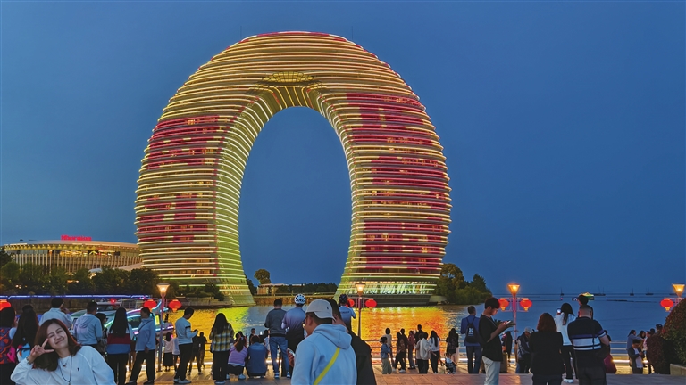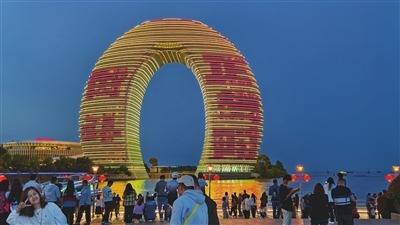 昨天,南太湖新区月亮酒店,以“奋斗正当时”等为主题词的庆祝“五一”、致敬劳模灯光秀吸引了众多市民和游客打卡拍照。记者 项飞 摄