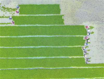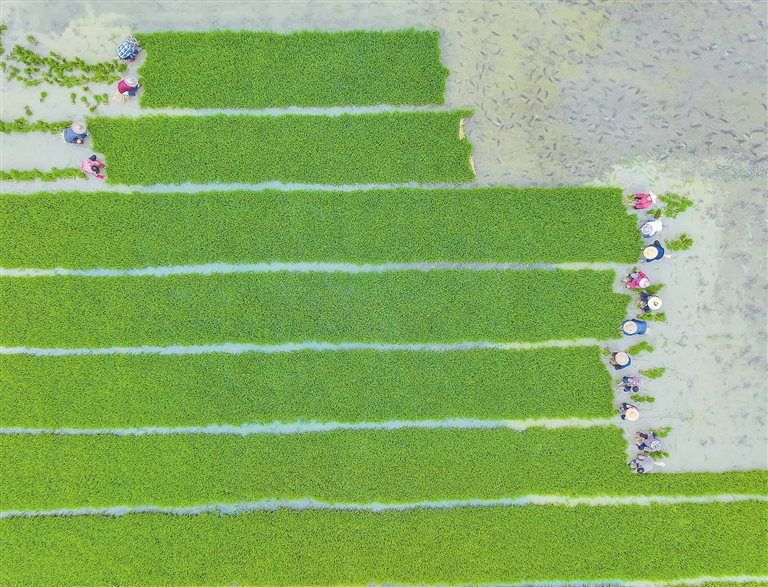 6月7日,在长兴县虹星桥镇后羊村,村民们抢抓农时,在农田里搬运、移栽秧苗,一派繁忙景象。