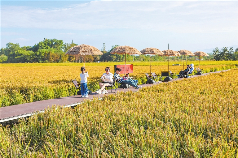 11月21日,长兴县虹星桥镇宋高村,游客们沉浸在秋日稻田美景中。近年来,该县发展文旅产业新业态,乡村咖啡馆、度假康养、精品民宿等农文旅新兴业态如雨后春笋般出现,为乡村振兴注入新活力。记者 吴拯 摄