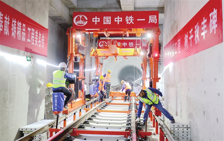 昨天,杭德市域铁路莫干山高新区站接轨点,随着最后一节轨排成功铺设,该铁路I标段轨道工程顺利贯通,为后续轨道精调奠定坚实基础。 记者 谢尚国 王树成 摄