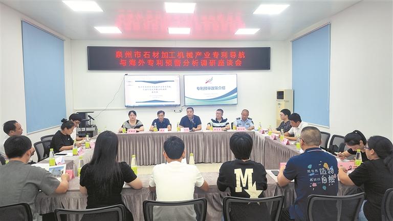 本报讯 (记者郭剑平 通讯员林超胤 文/图)为增强泉州市石材加工机械产业国际市场风险防范意识,提高海外知识产权纠纷、风险的防控能力,提升海外知识产权保护意识和能力,近期,泉州市知识产权保护中心(以下简称“泉州保护中心”)组织有关专家及工作人员深入南安市水头镇、洛江区、晋江市等地,开展为期三天的泉州市石材加工机械产业专利导航与海外专利预警分析项目调研走访活动。